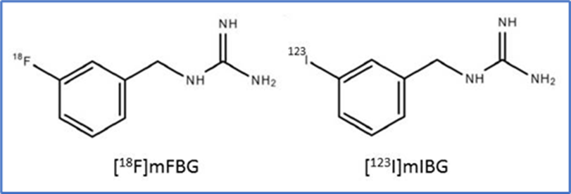 metaiodobenzylguanidine (mIBG) הינו אנלוג מבני של נוראפינפרין, ומזה כ- 40 שנה, mIBG מסומן ביוד-123 או ביוד-131 (123/131I-mIBG) משמש לדימות (imaging) ולטיפול בגידולים, המבטאים את ה- NET, בהתאמה.